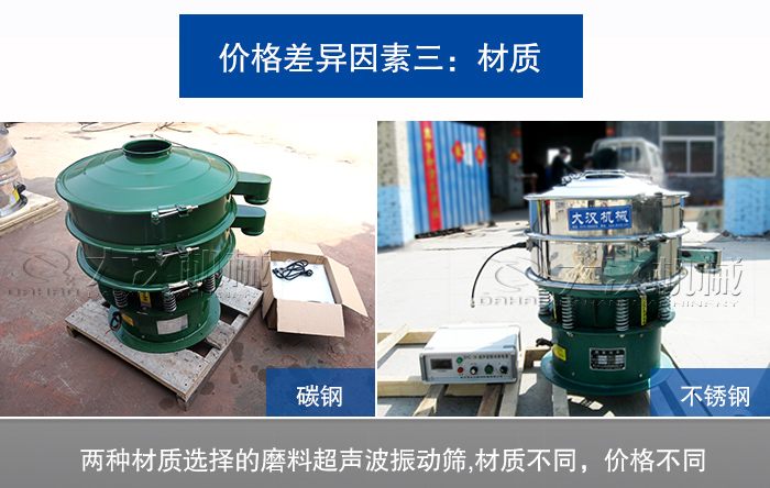 磨料超聲波振動篩有三種結構規格:1.整機均采用不銹鋼制成;2.整機均采用碳鋼制成;3.(標機結構)物料接觸不分為不銹鋼材質,底座為碳鋼材質,其中全不銹鋼的價格大于標機結構,標機結構的價格大于全碳鋼結構。