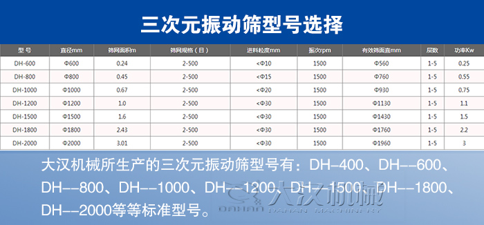 大漢機械所生產(chǎn)的三次元旋振篩型號有:DH-400、DH--600、DH--800、DH--1000、DH--1200、DH--1500、DH--1800、DH--2000等標準型號。