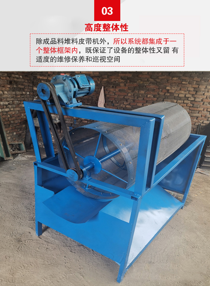 該產品的主要依靠驅動裝置帶動滾筒篩網,對于物料做360°旋轉時篩分,在滾動篩網的作用下,物料能夠輕松的達到分散的狀態,從幫助篩網進行快速的篩分。通過篩網網孔的物料留到皮帶輸送機上,由出料口排出,而沒有通過篩網篩分的將從肥料口排出,從而完成物料的篩分目的。