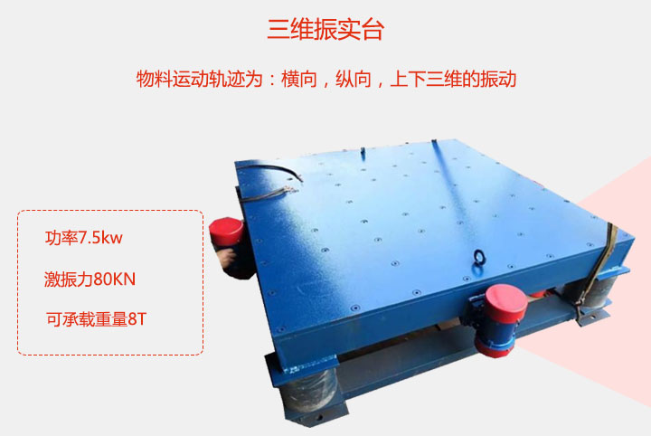 三維振實臺其利用振動電機作為振動來源,使物料在工作臺上完成:橫向,縱向,上下三維的運動軌跡,所以稱之為三維振實臺。該設備的振動電機個數為雙數例如:4,6,8,10等而振動電機的型號決定了三維振實臺的主要技術參數。