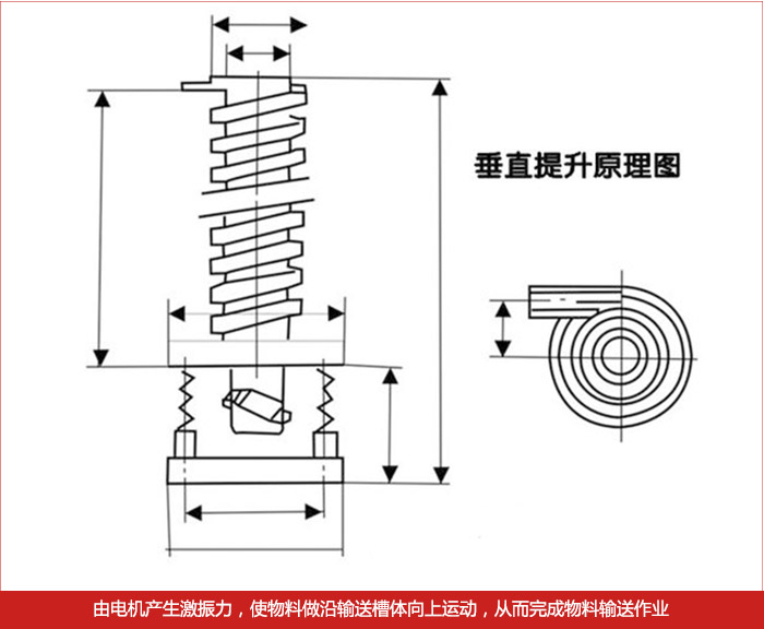 螺旋垂直振動(dòng)提升機(jī)DZC系列垂直振動(dòng)輸送機(jī)的驅(qū)動(dòng)裝置振動(dòng)電機(jī)安裝在輸送塔下部,兩臺(tái)振動(dòng)電機(jī)對(duì)稱交叉安裝,輸送塔由管體和焊接在管體周圍的螺旋輸送槽組成,輸送塔座于減振裝置上,減振裝置由底座和隔振彈簧組成。當(dāng)垂直輸送機(jī)工作時(shí),根據(jù)雙振動(dòng)電機(jī)自同步原理,由振動(dòng)電機(jī)產(chǎn)生激振力,強(qiáng)迫整個(gè)輸送塔體作水平圓運(yùn)動(dòng)和向上垂直運(yùn)動(dòng)的空間復(fù)合振動(dòng),螺旋槽內(nèi)的物料則受輸送槽的作用,作勻速拋擲圓運(yùn)動(dòng),沿輸送槽體向上運(yùn)動(dòng),從而完成物料的向上(或向下)輸送作業(yè)。